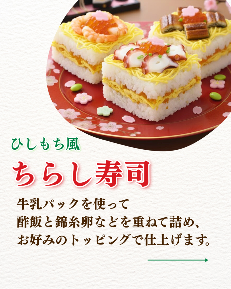 2026.02.24 牛乳パックが大活躍!手作りで彩る、桃の節句。 今年のひなまつりは、手作りで春をお祝い🎎✨ 特別な道具は使わずに、 身近な牛乳パックで 可愛い「ひしもち風ちらし寿司」を作ってみませんか? 「どの具材をのせようかな?」と親子で会話を楽しみながら とっておきの春の思い出を作ってみてくださいね。 —————————————————————- 魚六商店オンラインショップはこちら!(全国発送可能) https://shop.uo6.jp/ TEL:078-922-8833 FAX:078-922-8836
